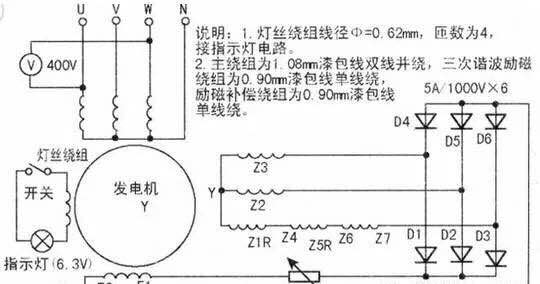 柴油發電機組實質是臺三次諧波自勵磁凸式三相四線同步發電機,因具有輸出功率大、適合移動等優點,故廣泛用于廠礦、工程施工等場合。雖然功率不同的發電機,其繞組數據有所不同,但電路連接基本相同。